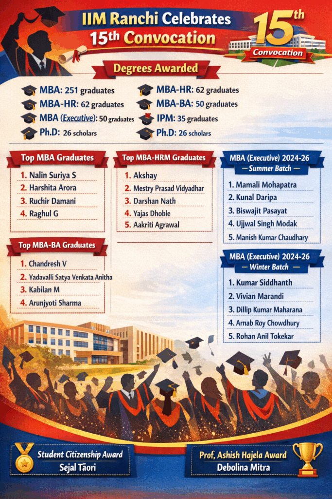 IIM Ranchi के 15 वें दीक्षांत में उपराष्ट्रपति ने दी सीख – अनुशासन अपनाएं, अनावश्यक खर्च से बचें और धैर्य के साथ निर्णय लें