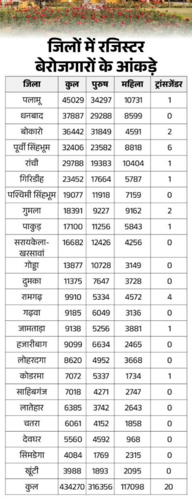 झारखंड में 316356 पुरुष, 117098 महिलाएं और 20 रजिस्टर्ड ट्रांसजेडर हैं बेरोजगार, रजिस्टर्ड नियोक्ता केवल 7,784